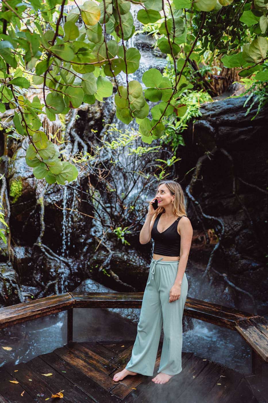 The sound of flowing water from the artificial waterfalls creates a soothing audio backdrop