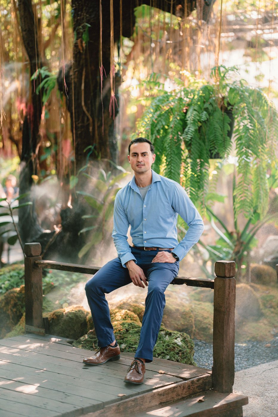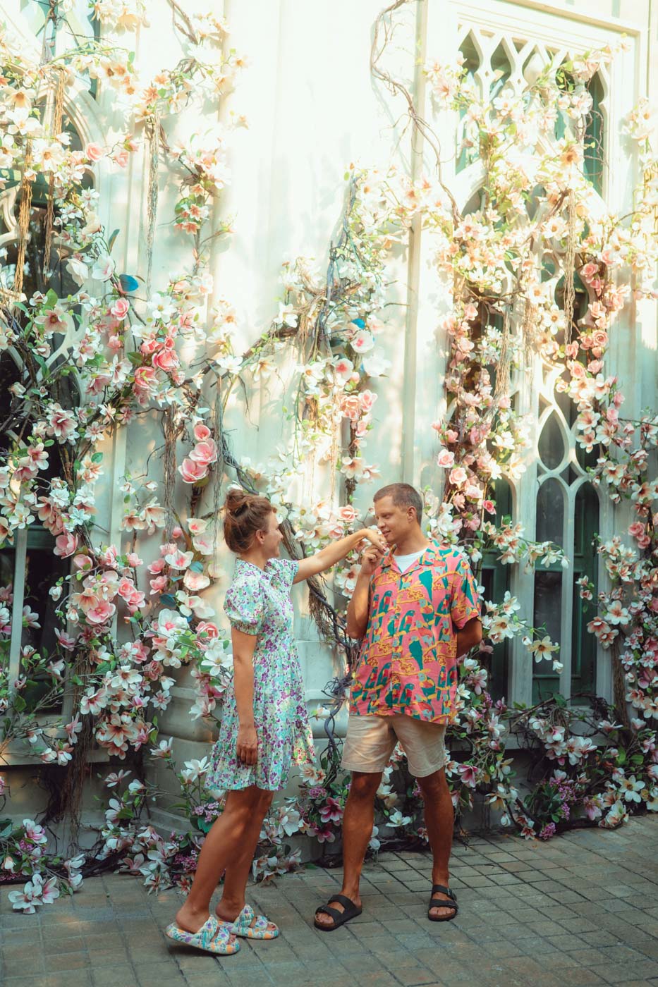 This garden setting makes a charming backdrop for engagement or pre-wedding photos with its romantic atmosphere and water features.
