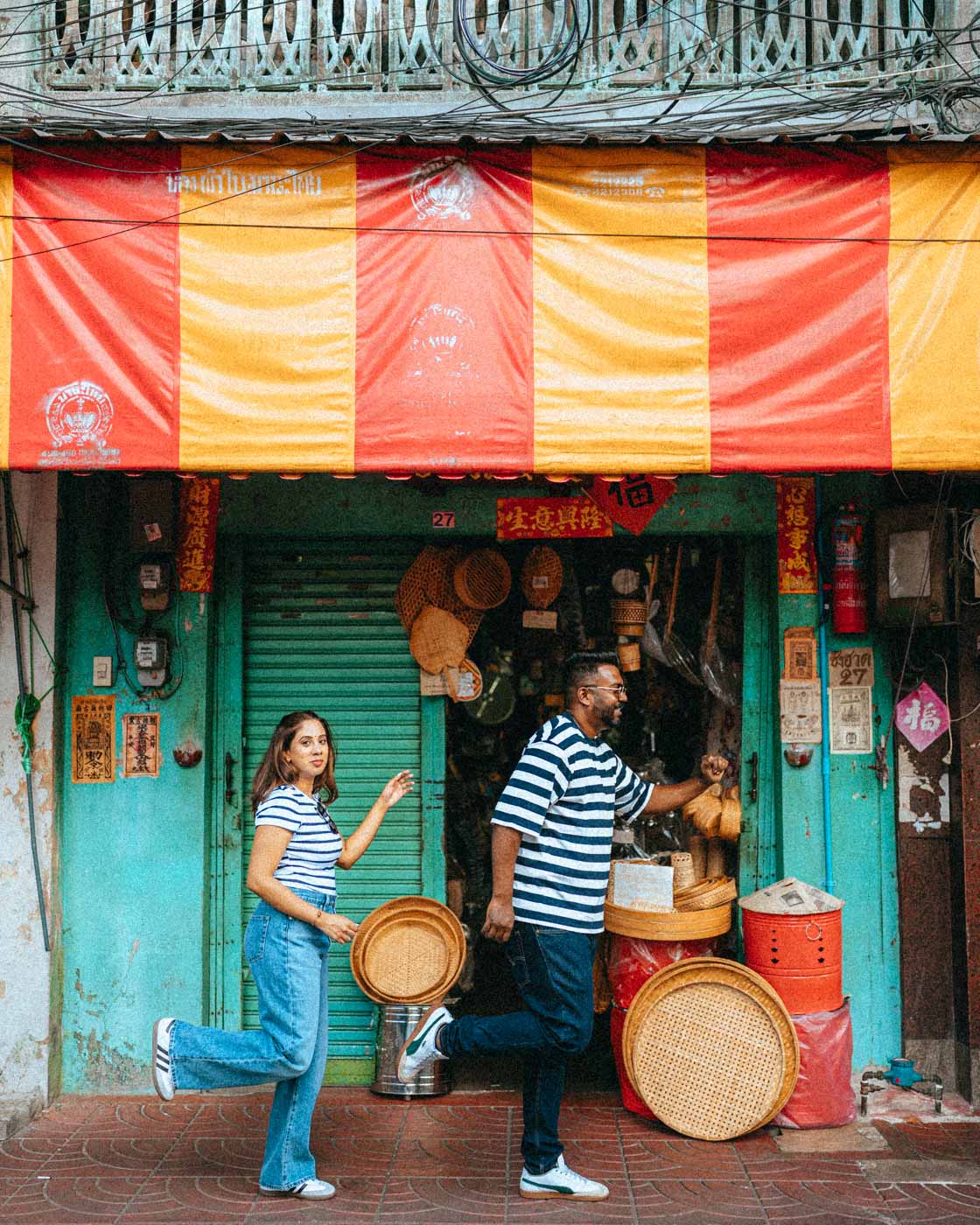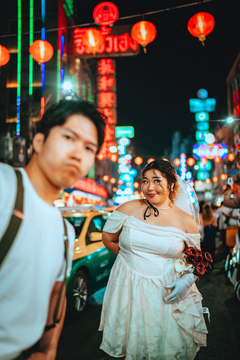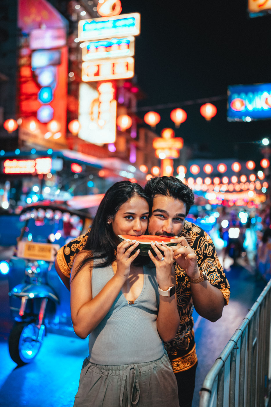 We were so awkward at first, but within 10 minutes we completely forgot the camera existed. The neon lights with tuktuks shots are insane. We look like we're in a movie. Every single image feels like us, not some fake Instagram version. Exactly what we wanted.
