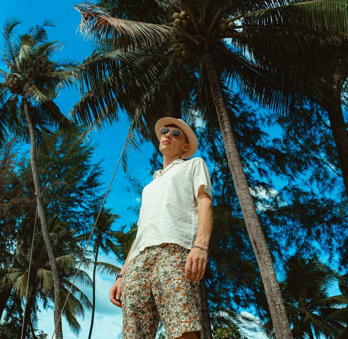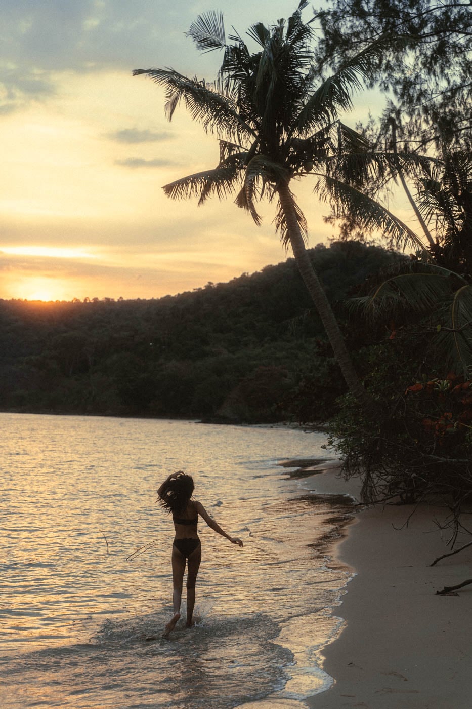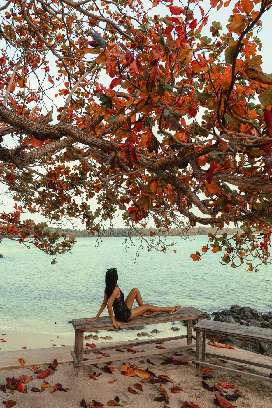 This is our favorite spot on the island. The water is clear and the trees grow right up to the shoreline, which creates natural framing that's hard to find elsewhere. The combination of shade, water, and tropical greenery gives us a lot to work with in a single location.