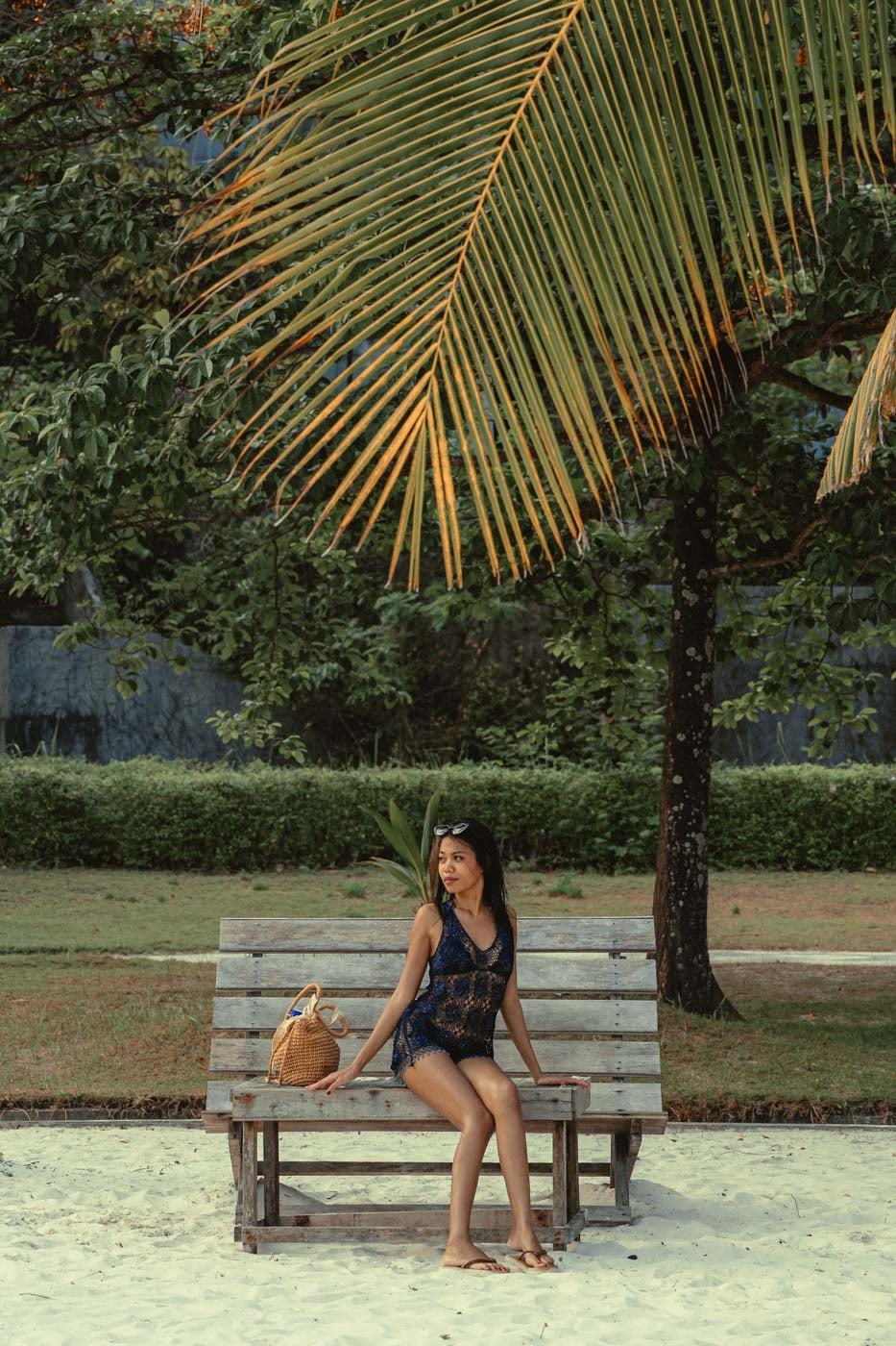 The wooden deck here is long and well-maintained. The overall vibe fits a relaxed, warm aesthetic. There are spots near the beach, around rocks, and among the greenery that give you real variety within one location. You don't need to book the hotel to shoot here, which makes it flexible for clients staying elsewhere on the island.