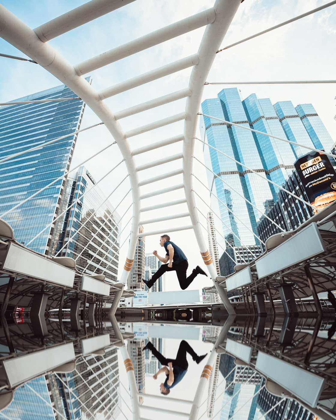 Remember that good posture instantly improves any photo. Take a deep breath before each shot, relax your shoulders, and think about lengthening your neck. Whether you're on the elevated walkway or in front of the pixel building, good posture makes every location look better!