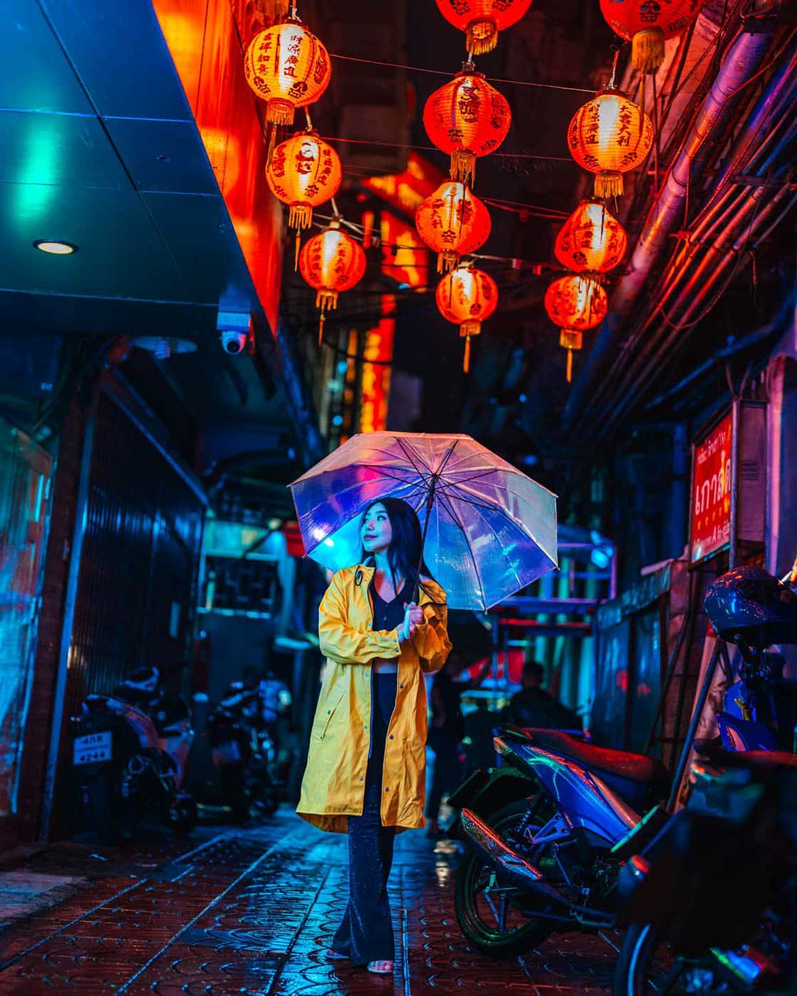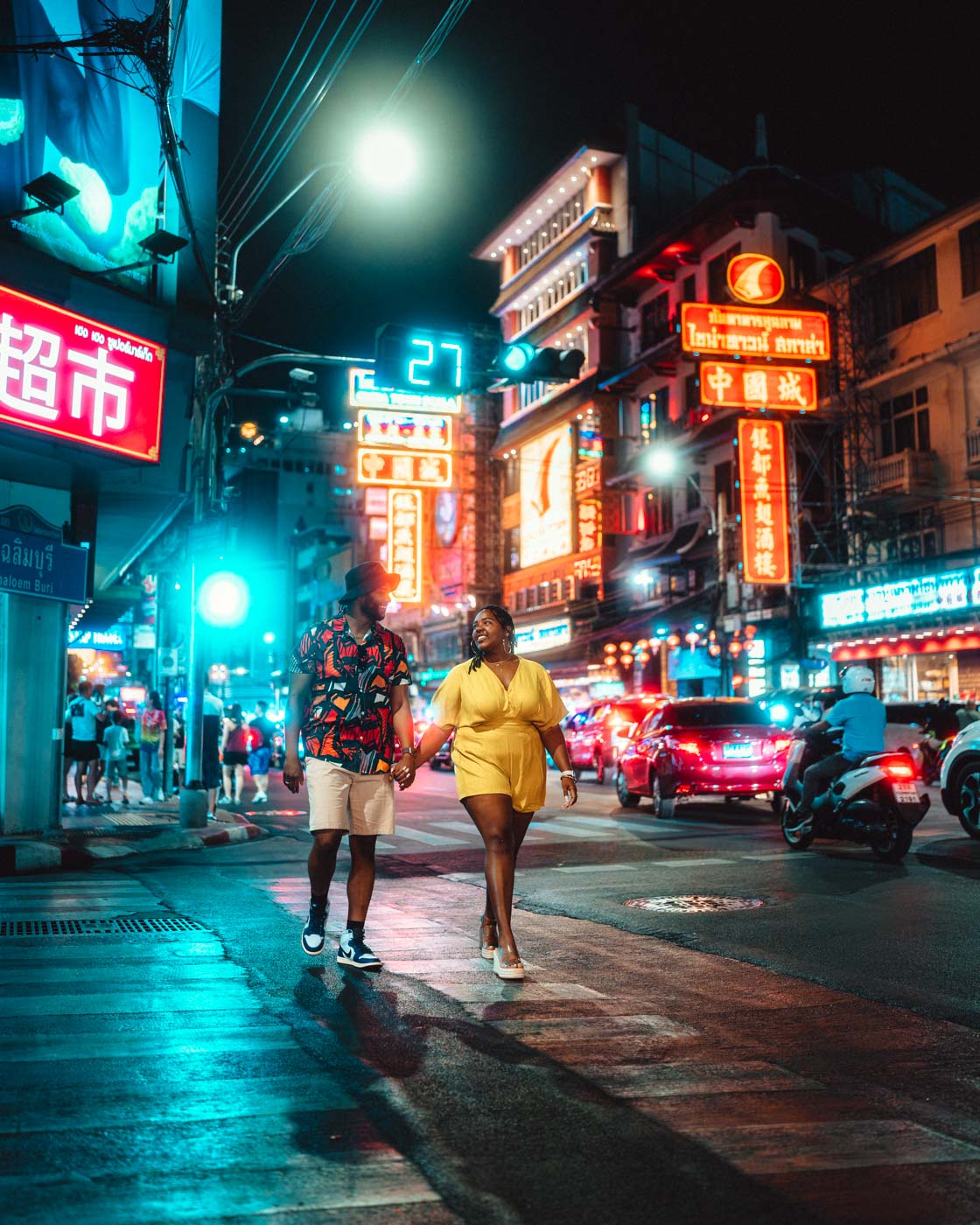 You can book a two-hour session that combines both styles on the same day. Start with cinematic shots in the urban area, then move to Chinatown for the colorful neon finale.