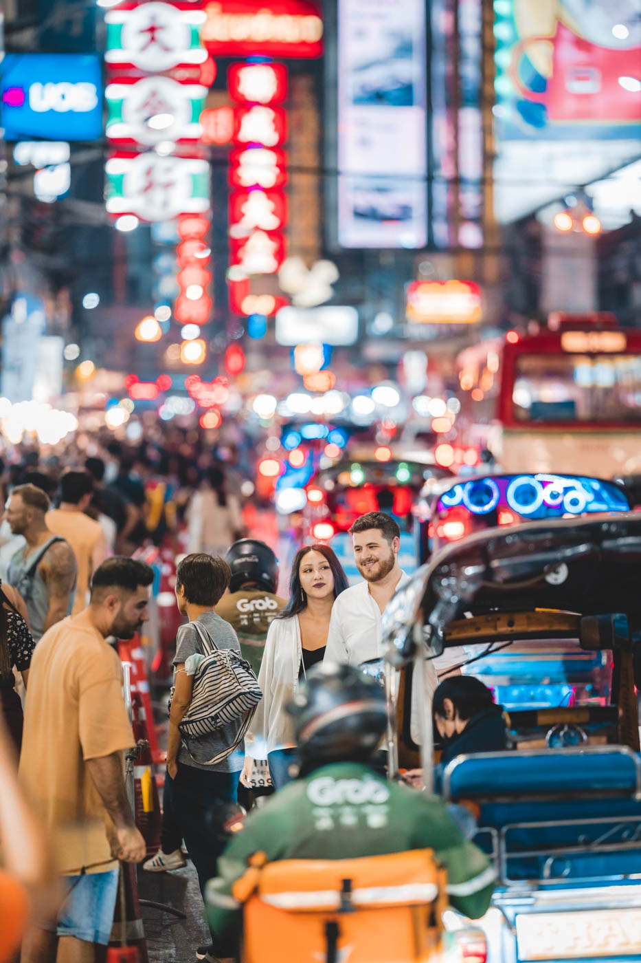 We'll capture you interacting with snack stalls, eating noodles at local spots, walking among the crowd, or sitting in a tuk-tuk.