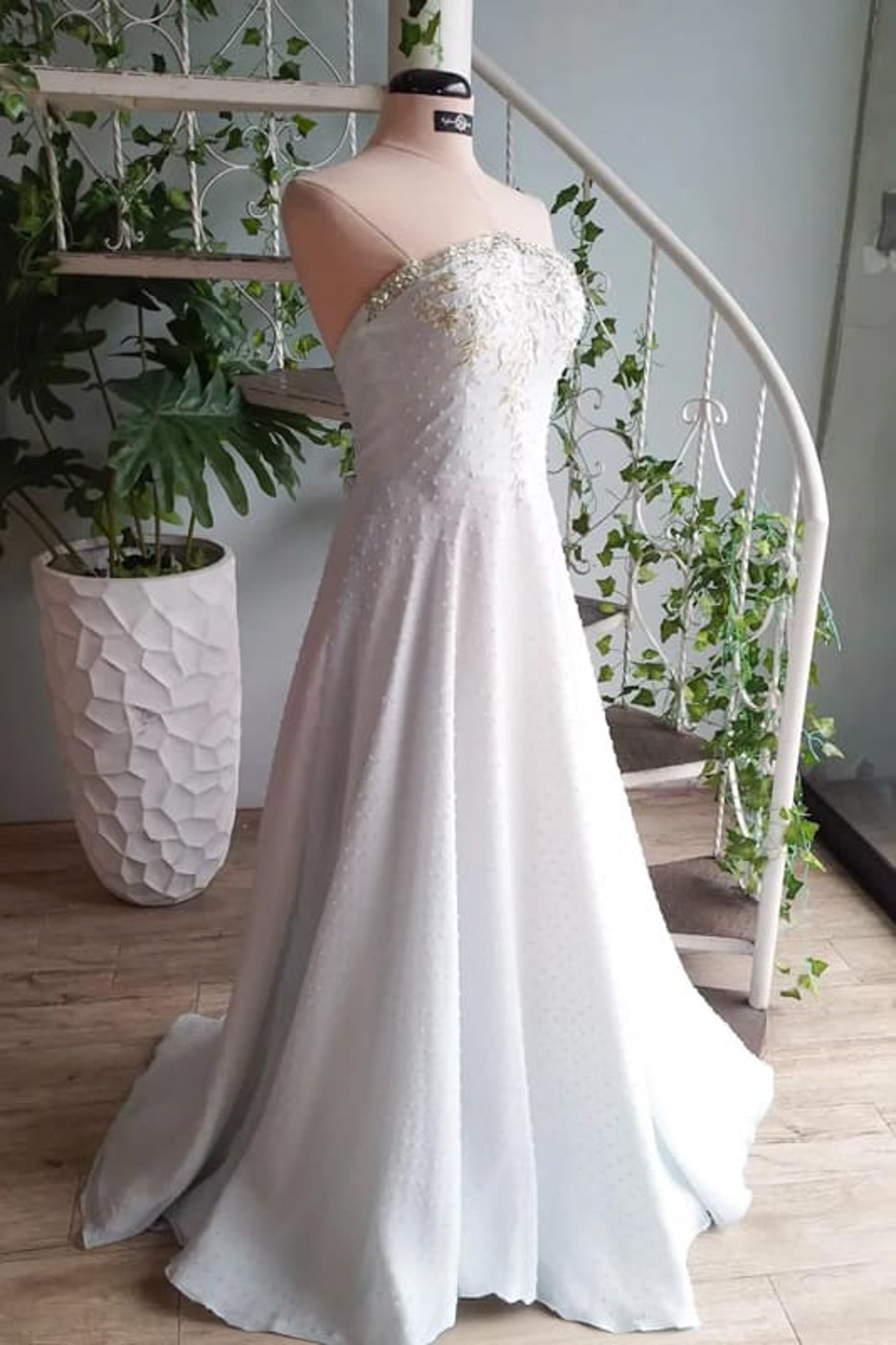 The rental shop carries everything from classic A-line wedding gowns to sleek evening dresses for a more glamorous vibe. You'll find options with lace details, beading, simple satin finishes, and dramatic trains.