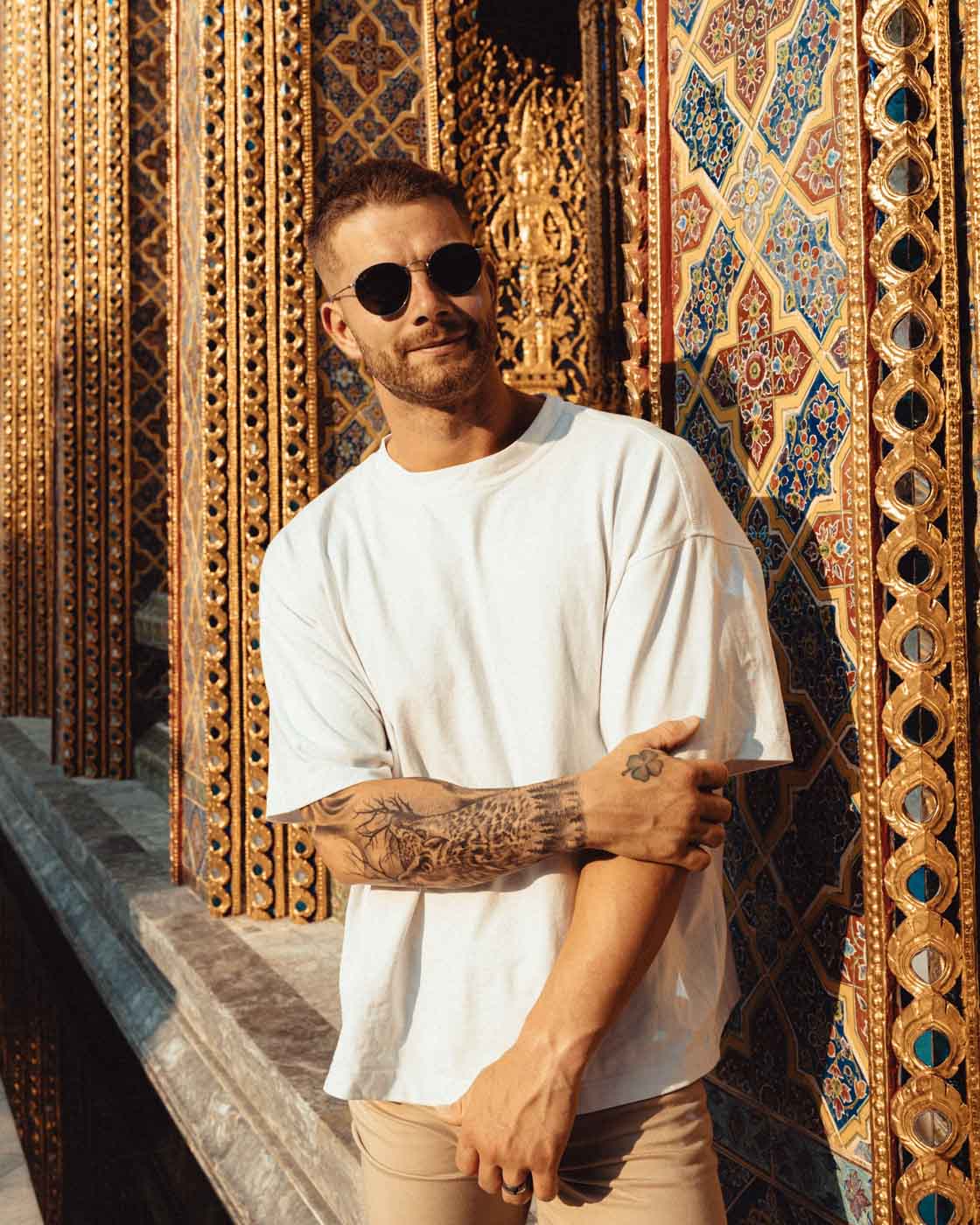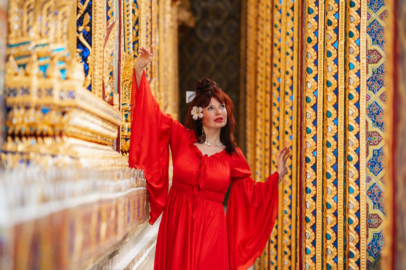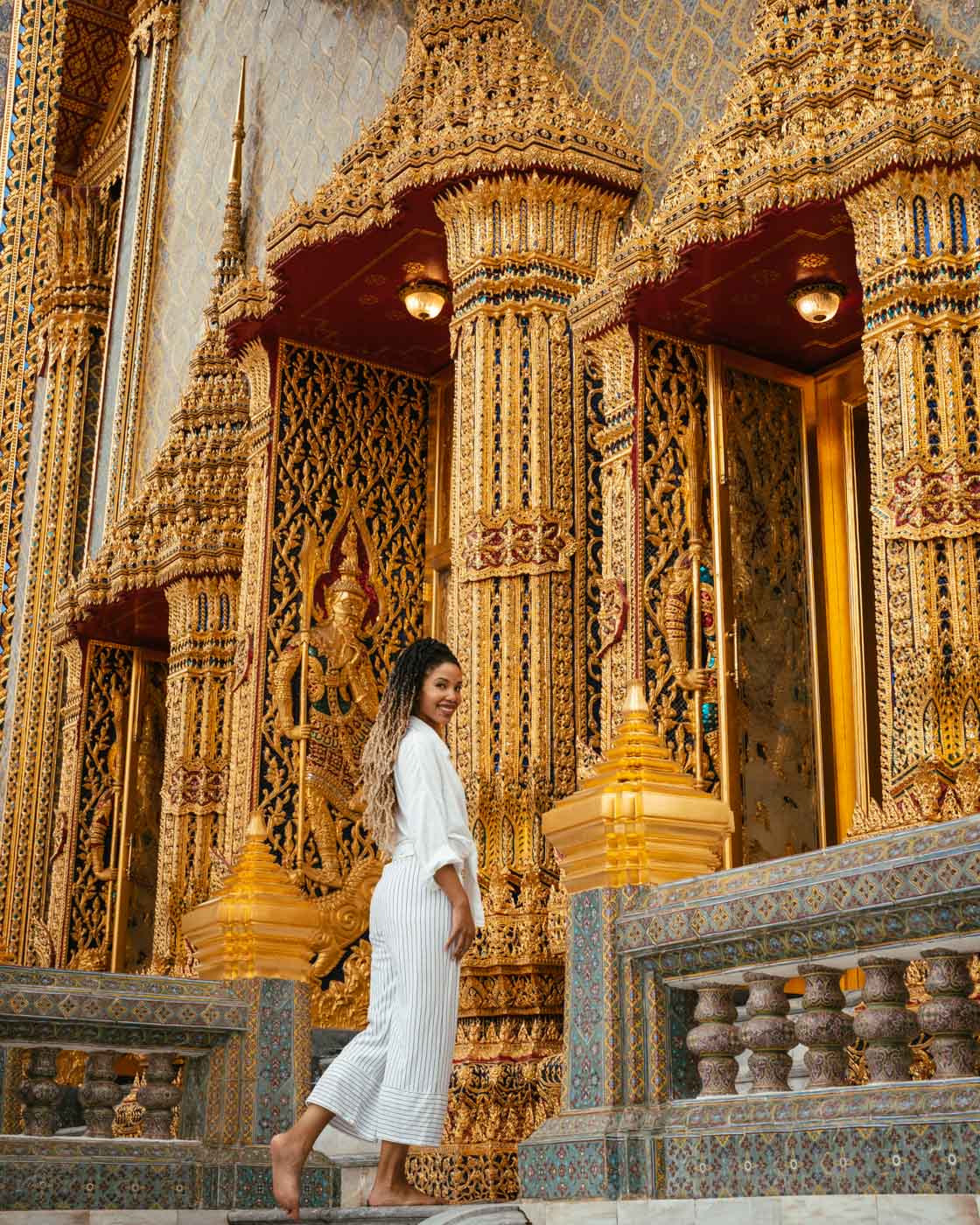 We love the golden hour after 3:30 PM when the light turns warm and soft, making the temple's gold shine beautifully. We can take photos until about 5:40 PM, depending on the season. Remember, it gets dark after 6 PM in Bangkok. This magical afternoon light creates the most flattering and atmospheric photos of both you and the temple's stunning architecture.