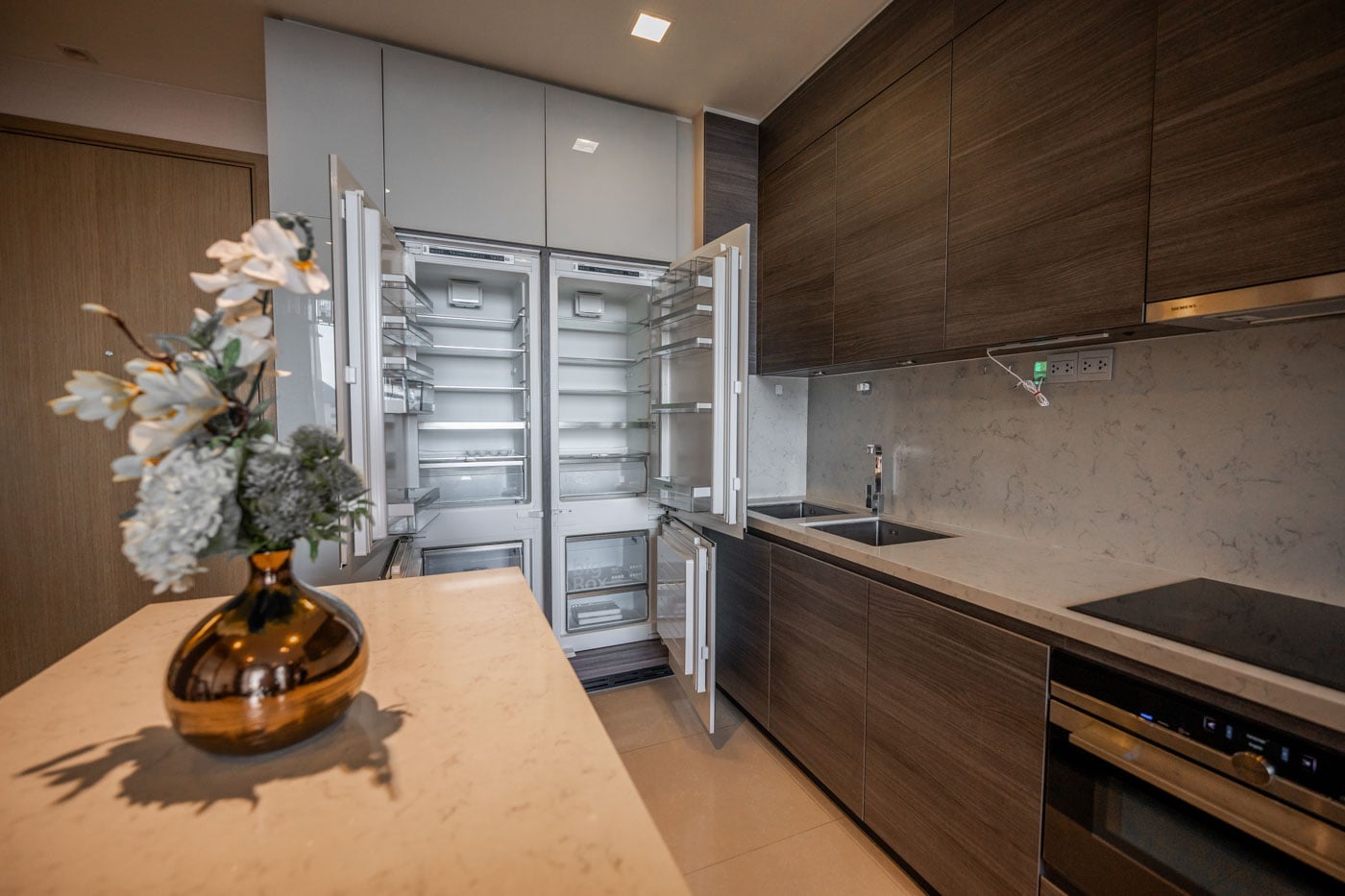 We shoot with a wide-angle focal range to capture maximum space without distortion. This technique is essential for interior and architectural photography. Some photographers use ultra-wide lenses that create unnatural distortion. We avoid this by selecting the optimal focal length for each space, ensuring images look natural and accurate. For architectural work, we use tilt-shift lenses to maintain distortion-free verticals. We balance natural sunlight with subtle flash fill to preserve realism while adding dimensional depth.