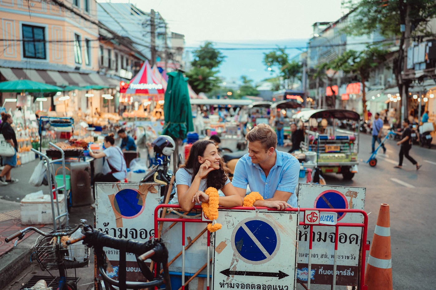 Most sessions happen during golden hour when Bangkok's afternoon light softens the city's edges. But we also work after dark, when neon transforms familiar roads into something cinematic - red lights reflecting off wet pavement, the glow of vendors' carts creating islands of warmth in the urban night.