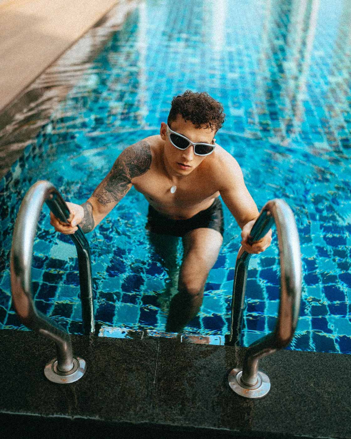 Creating the perfect look requires thoughtful planning. Opt for colors that contrast with the blue pool - reds, whites, and yellows pop against the blue backdrop. Both color and black and white photography work wonderfully in swimming environments.