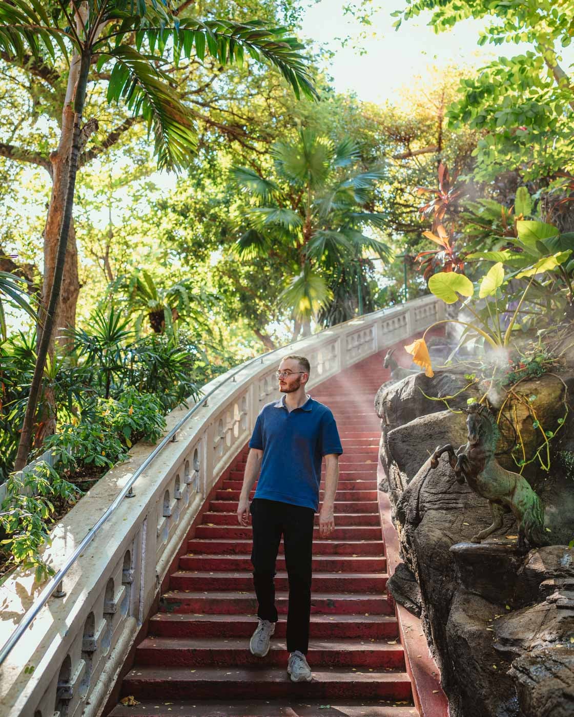 The path upward offers countless opportunities for creative shots. You can capture the gentle curve of the stairway or frame your subject against the lush greenery. Take your time during the climb - some of the most striking images come from spots you might otherwise pass by.