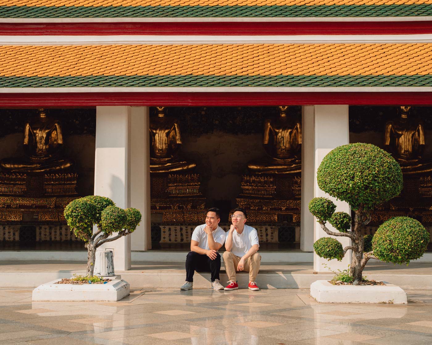 Keep your poses natural and modest - no dramatic gestures that might seem disrespectful in a sacred place. Always face away from Buddha statues when taking photos, and keep your posture dignified throughout the session. We'll show you appropriate poses that respect this place's spiritual meaning while creating beautiful images.